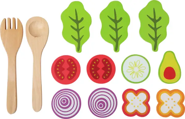 Kinderen kunnen alle ingrediënten in de plastic kom gooien en met het houten bestek vrolijk door elkaar husselen. Zo maken ze hun eigen fantasiesalade, precies zoals zij hem het lekkerst vinden.