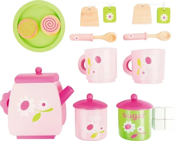 Het servies is gemaakt van gelakt hout en versierd met fijne bloemmotiefjes. De set is compleet met: – 2 lepeltjes – 2 theezakjes – 2 suikerklontjes – 2 bordjes – 2 koekjes